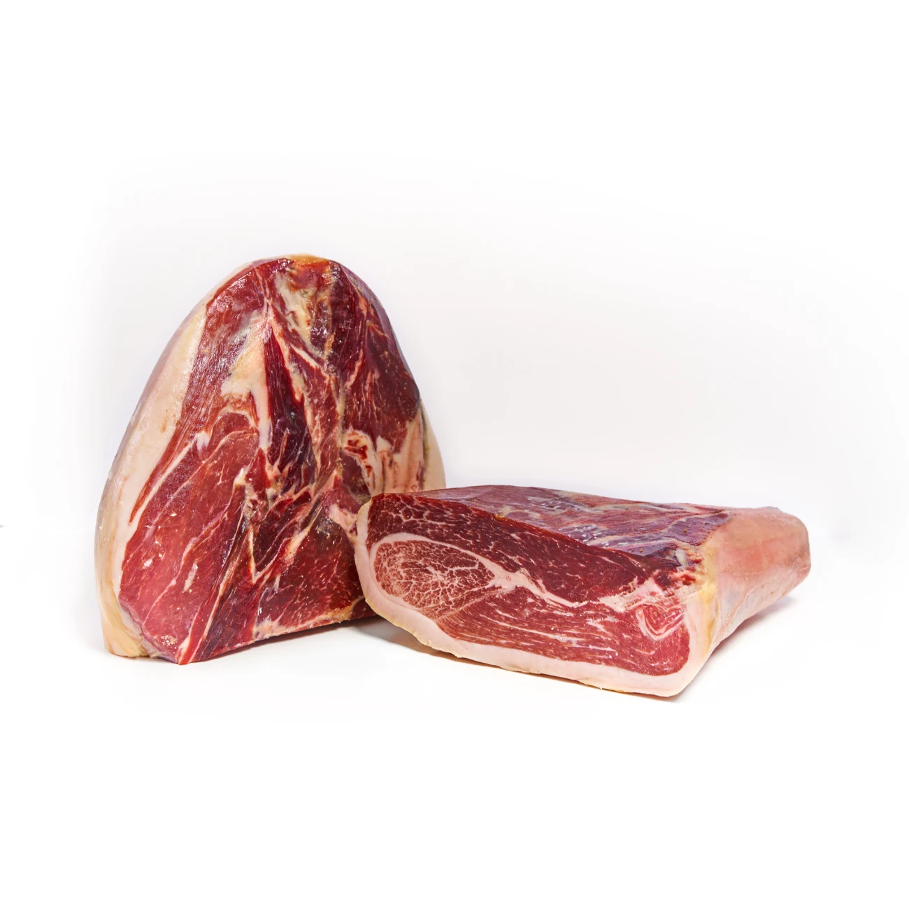 Tras un largo periodo de curación natural, a través de un proceso de extracción de huesos y cortezas, como resultado final tenemos una pieza que otorga la capacidad de cortarlo sin necesidad de limpiar las partes inservibles y también se adapta de una manera fabulosa al troceado y a los cortes a máquina.